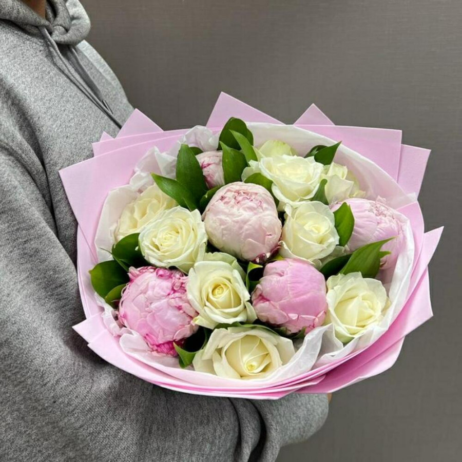 На фото букет «трепетное чувство». В составе: пион 5 шт, роза 9 шт, фоамиран 1 шт, атласная лента 1 шт, . Все цветы свежие и ароматные, букет красиво оформлен и отлично подходит для подарка. Доступна доставка цветов или самовывоз.